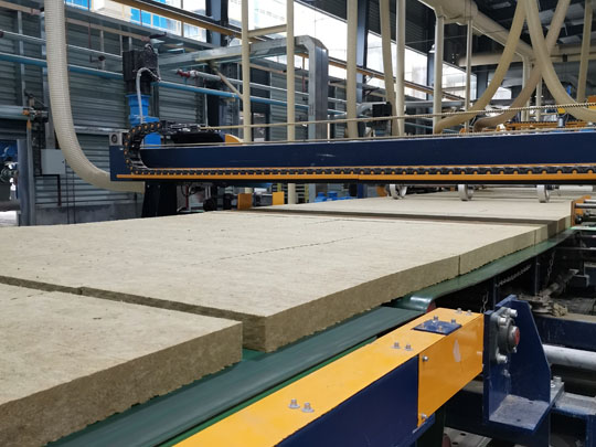 齊工巖棉板是以玄武巖為主要原材料,經過沖天爐高于1450℃使原材料充分熔化,經過高速離心機甩絲,形成巖棉纖維,用高速鼓風機使其噴吹冷卻成型,在噴吹過程中添加一定比例的高效粘合劑,由大型擺錘設備呈三維布棉狀態均勻鋪棉,由履帶將布好的巖棉傳送至壓力設備中,使其形成一定密度的巖棉板,后經高溫烘干爐烘干后,送至冷卻出風口使其冷卻固化,切割不同規格的成品。